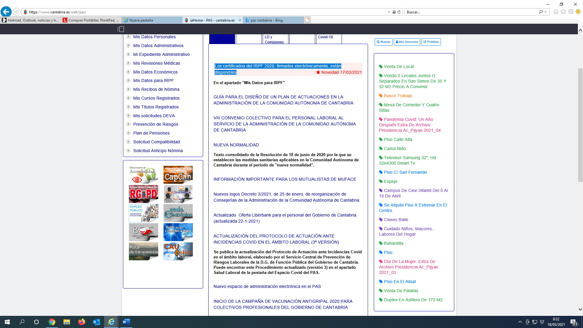 LOS CERTIFICADOS DEL IRPF 2020, FIRMADOS ELECTRÓNICAMENTE, ESTÁN DISPONIBLES EN LA PAGINA DEL PAS